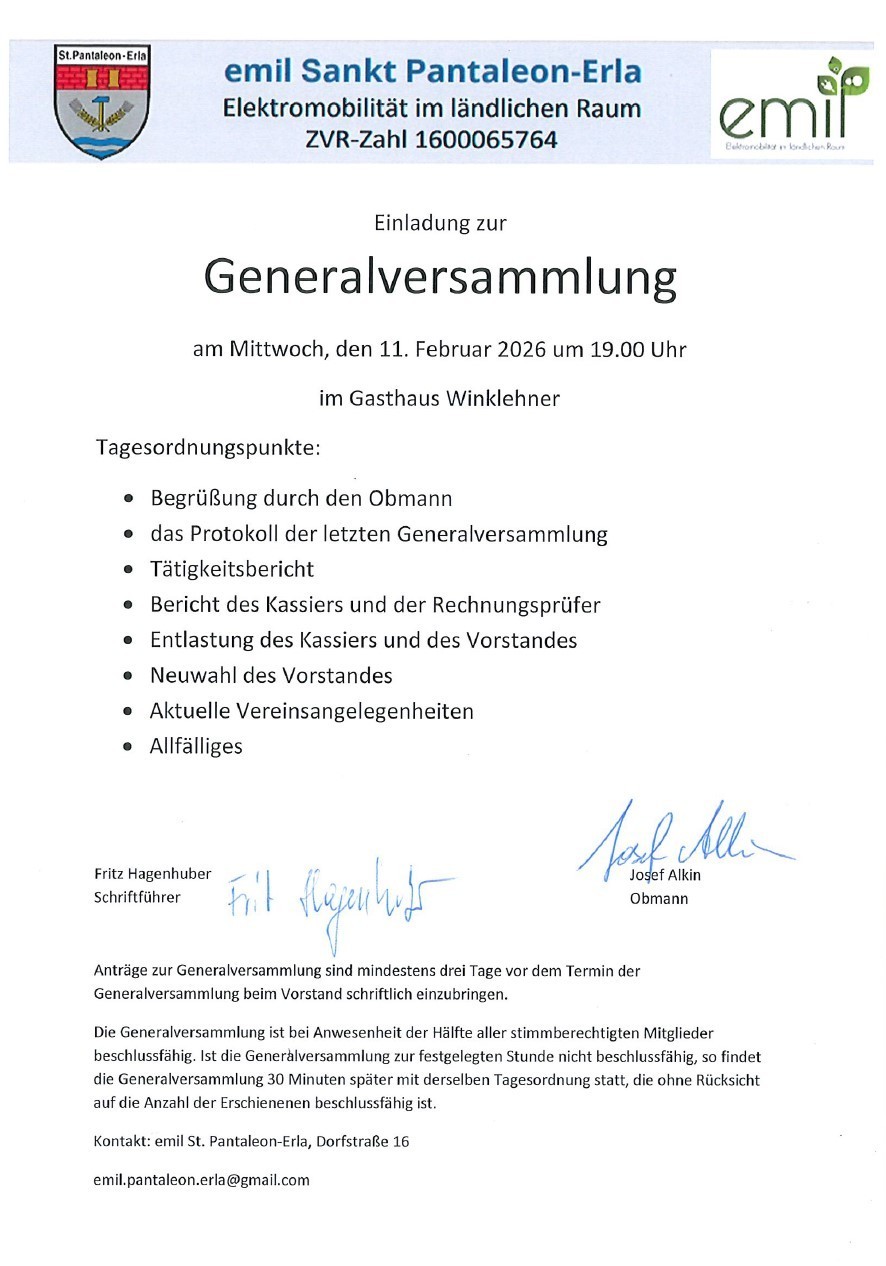 Der Verein emil St. Pantaleon‑Erla – Elektromobilität im ländlichen Raum, lädt alle Mitglieder herzlich zur diesjährigen Generalversammlung am Mittwoch, den 11. Februar 2026, um 19.00 Uhr im Gasthaus Winklehner ein.