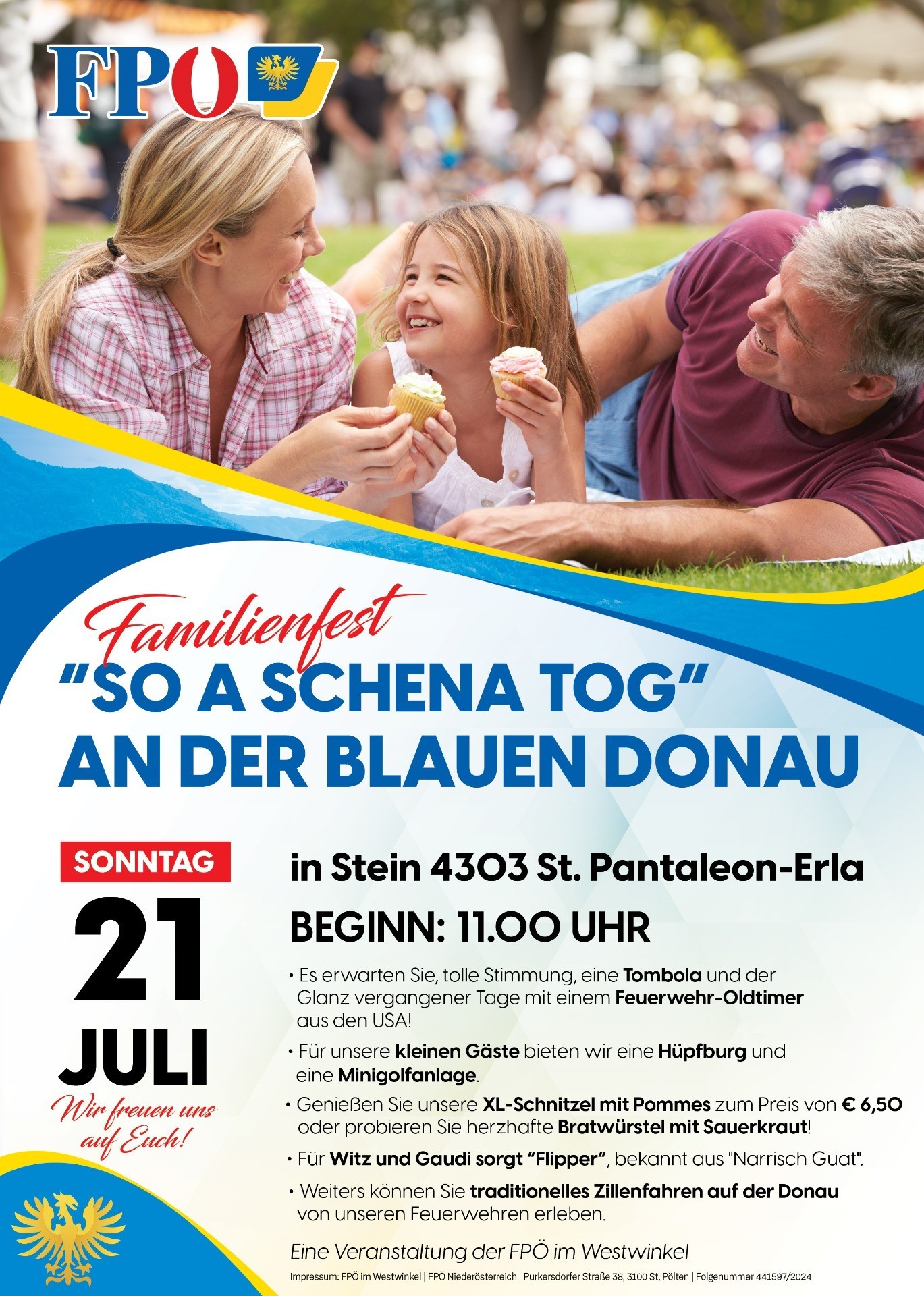 Tolles Kinderprogramm, Steckerlfische und Schweineschnitzel zum Sonderpreis! Veranstaltung findet nur bei Schönwetter statt.Fest an der blauen Donau der FPÖ im Westwinkel